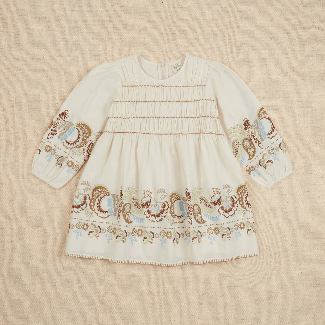 A beloved Apolina style, the Kari dress returns in a striking multi-coloured floral border print, inspired by vintage Russian folk scarves. The intricate hand-smocked chest releases to a full silhouette skirt with a cute, swingy style. The folk floral border print to hem and cuffs lends Kari a sweet bohemian mood. Invisible zip closure to back. Perfect just to pair with sandals or layered up with contrasting knits.
