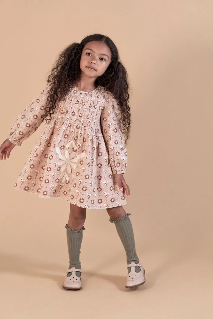 A beloved Apolina style, the Kari dress returns in a folk-inspired loaf tin floral print. The intricate hand-smocked chest releases to a full silhouette skirt with a cute, swingy style. Floral embroidery in cream sits sweetly against the vintage peach-toned base. Invisible zip closure to back.