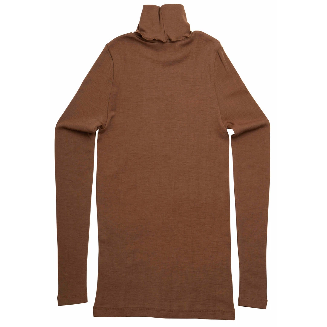 A classic turtleneck blouse made with high quality seamless merino wool. The simple design makes it versatile for a range of occasions. The wool is treated with positive ions, making it machine washable.Â