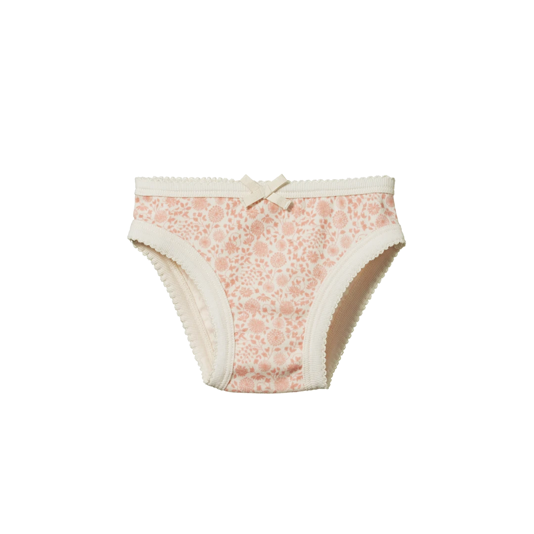 A classic style underpant in beautiful organic cotton fabric, with a nostalgic quality. These are super soft and stretchy. Comfortable with a soft elastic waistband, cotton picot stitching around legs and a sweet bow at waist.