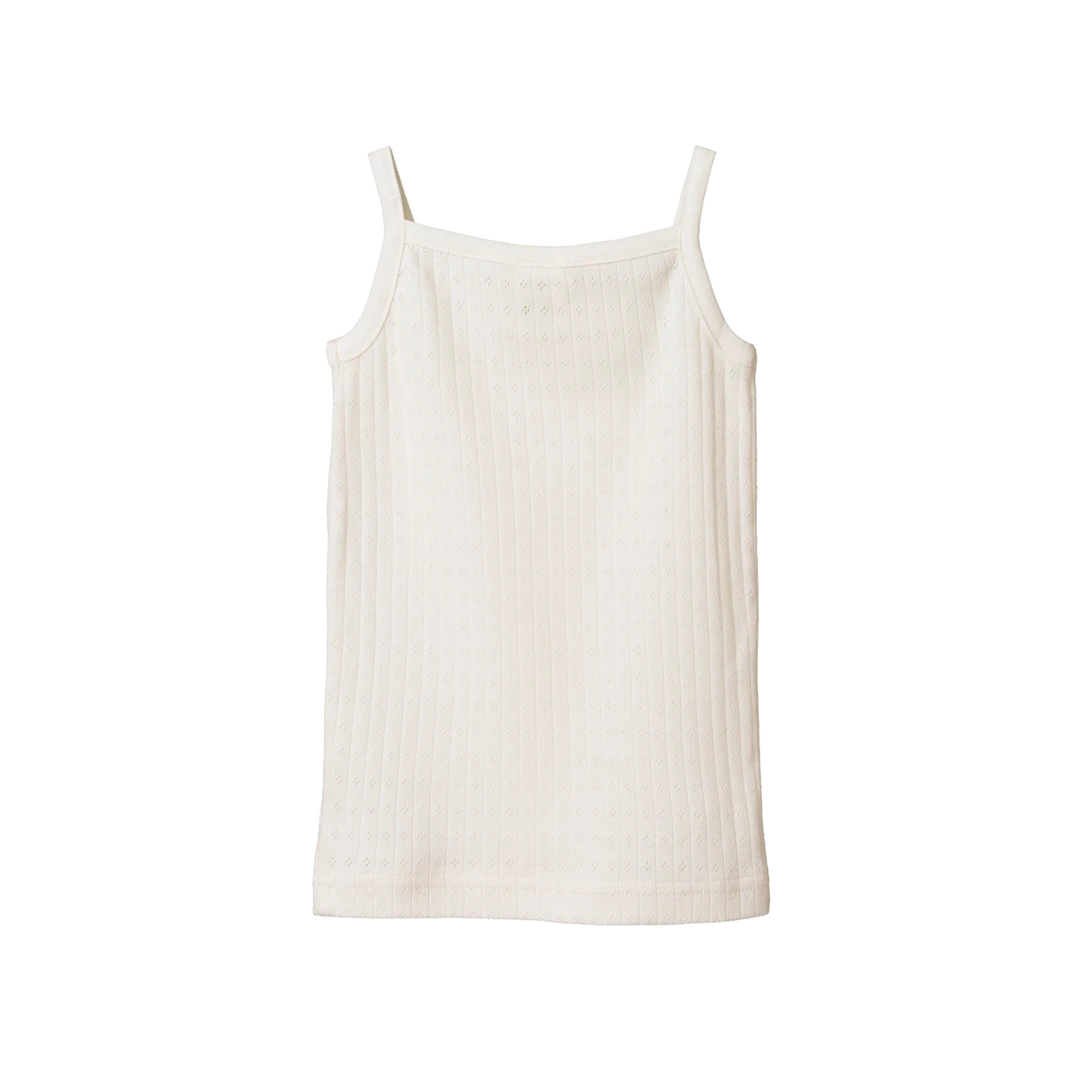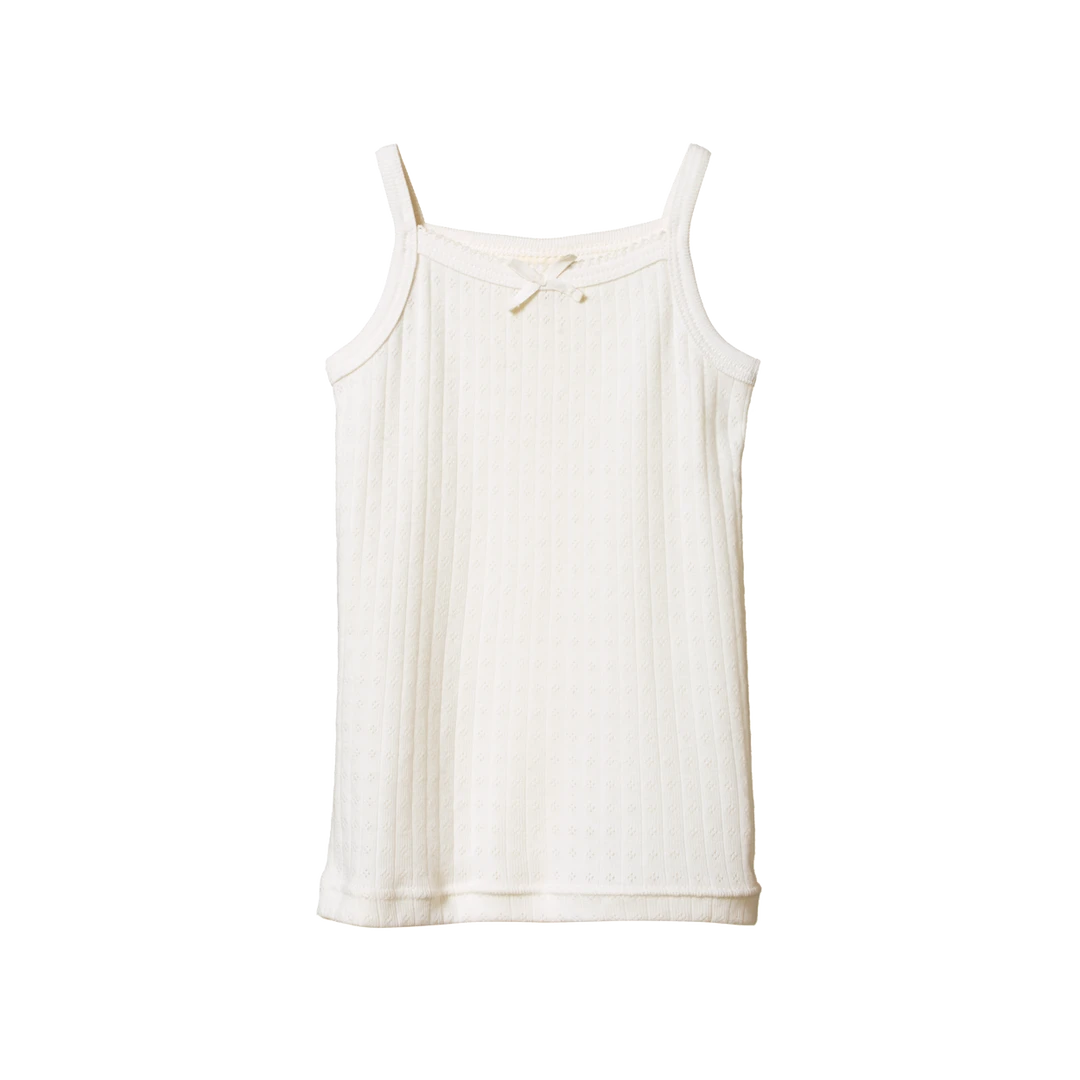 A beautifully sweet camisole made in beautiful pointelle fabric. Has a nostalgic quality and is super soft and stretchy. Almost too cute to wear as underwear! Features picot stitching detail along the front.