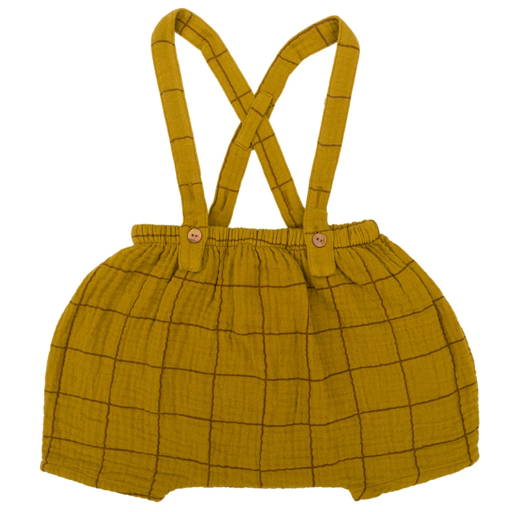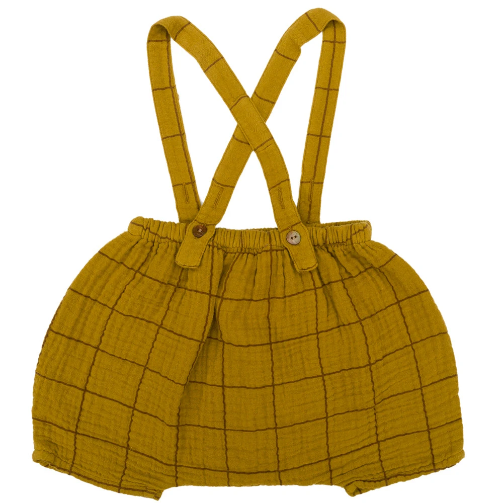 Omibia’s Henry Shorts are lovely both with tights and without, making them a versatile choice as the weather changes. They offer fantastic freedom of movement, but with greater length and coverage. Braces offer a whimsical look to the Henry Shorts, whilst also ensuring that little crawlers’ shorts stay on.